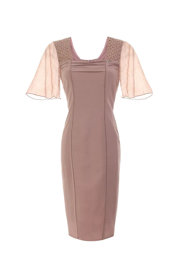 Elegantna, usko krojena haljina u krem nijansi sa V-izrezom, odvojivim lepršavim rukavi...