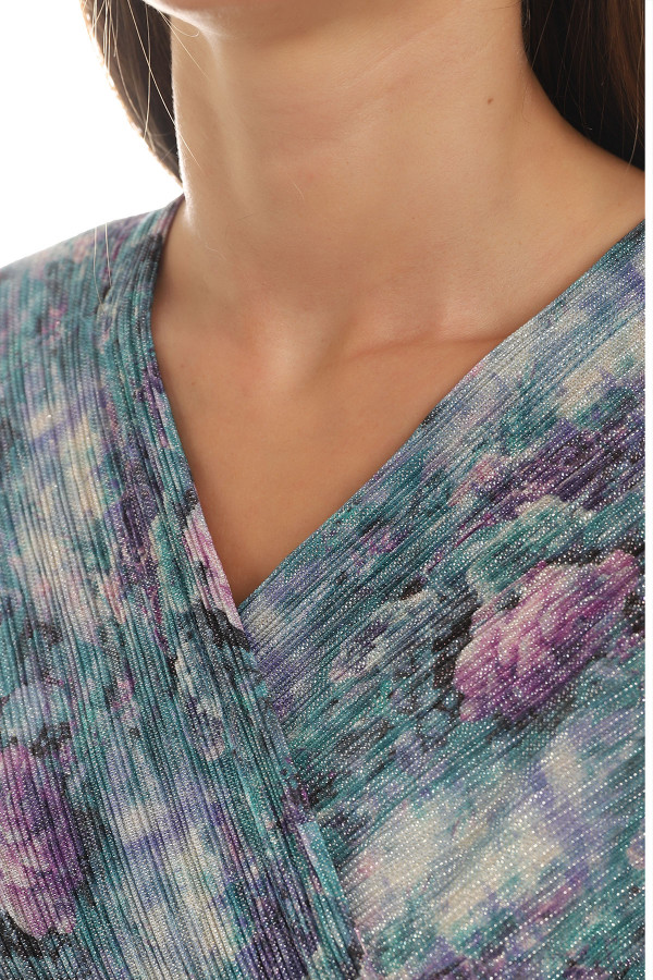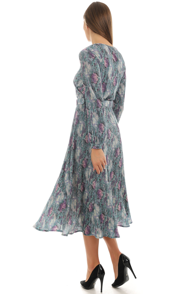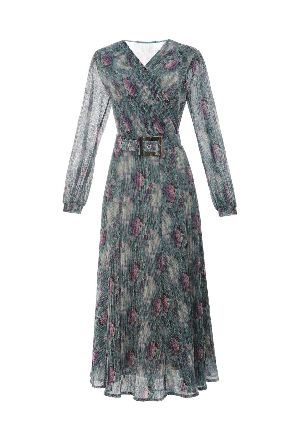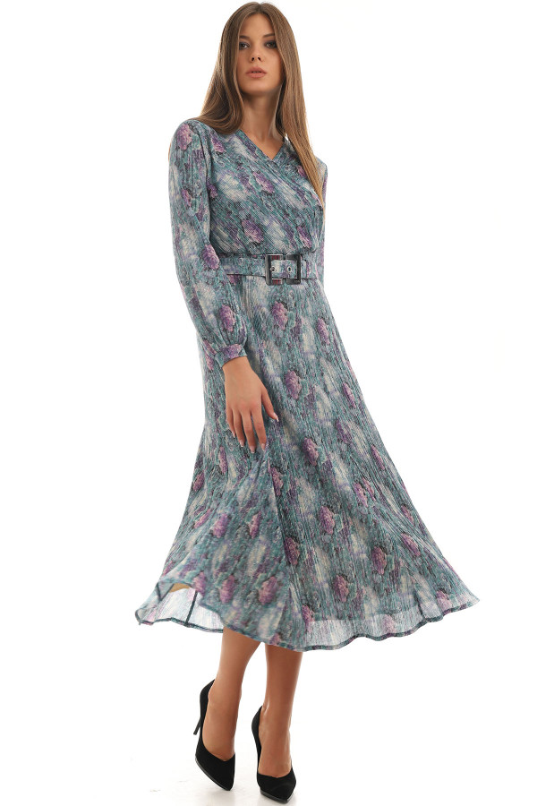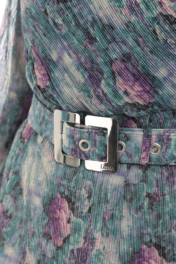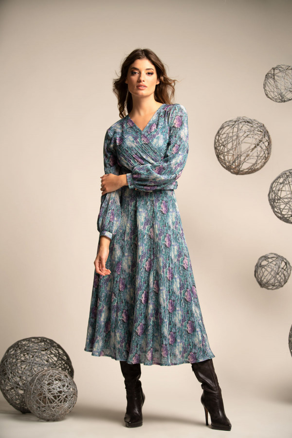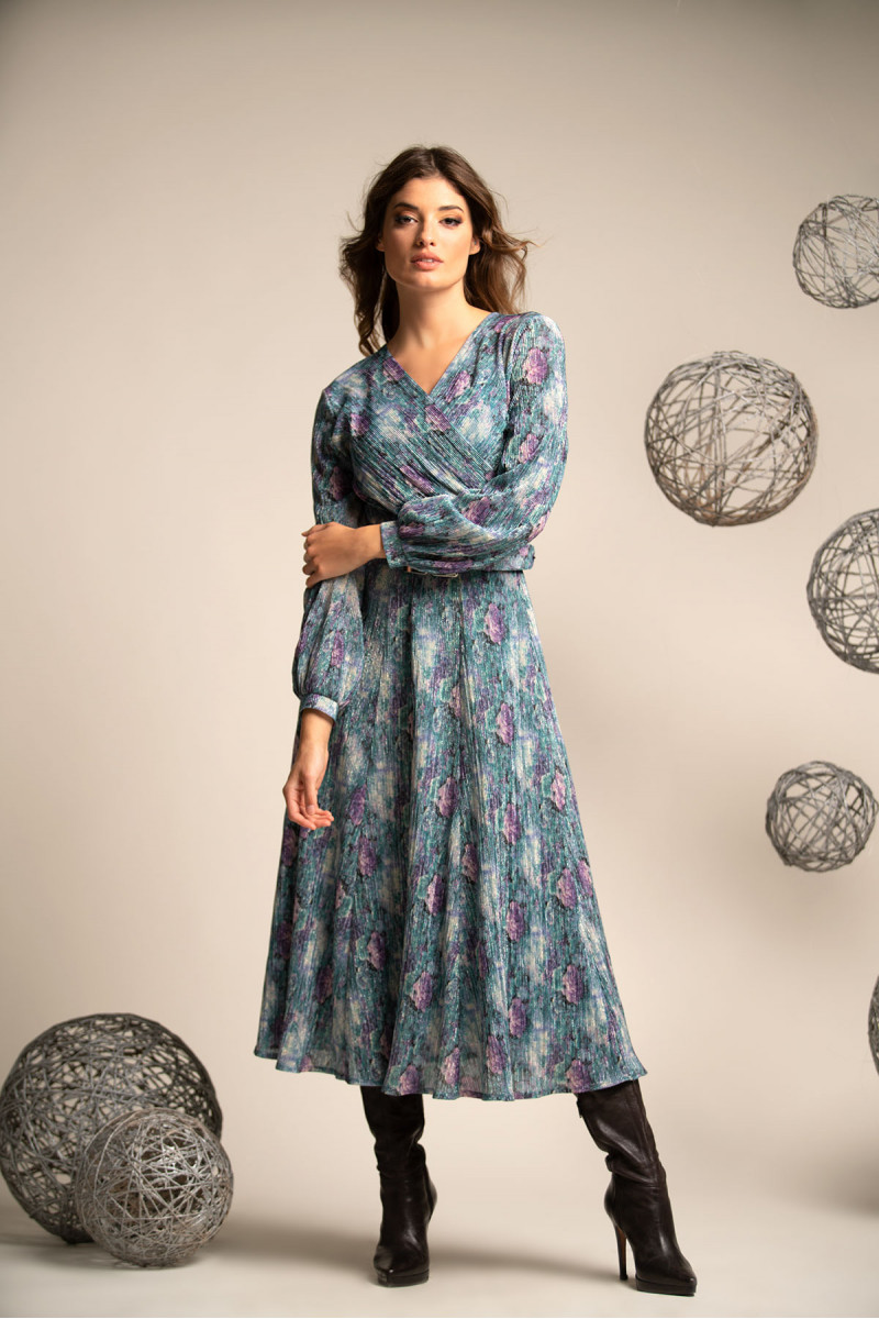 Za dame koje više vole šire haljine, ovaj model atraktivnog dezena je odličan izbor. Materijal je protkan metaliziranim vlaknima koja svetlucaju što je čini dodatno atraktivnom. U gornjem delu haljina je postavljena udobnom viskozom sa elastinom koji pruža udobnost. U predelu struka se nalazi širi kaiš, koji po potrebi možete skinuti, ima ulogu da Vaš struk učini užim.