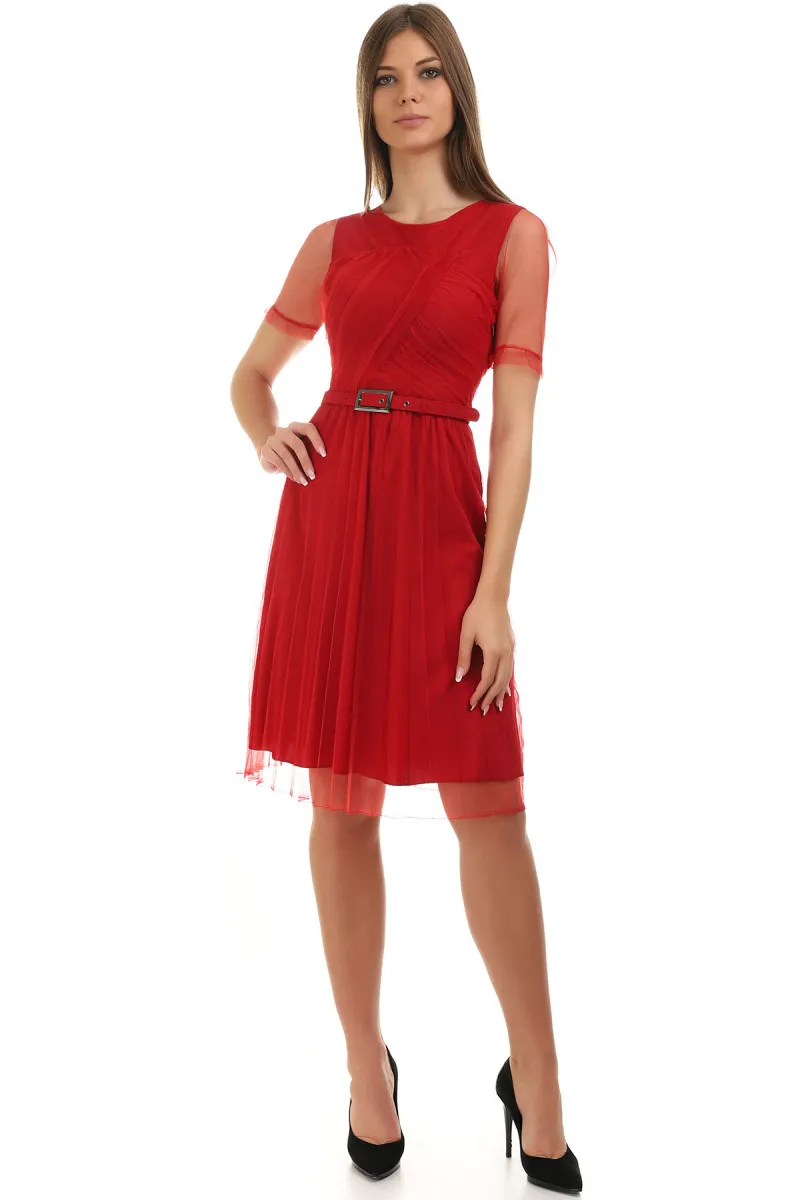 Široka midi haljina sa rebrastim dezenom u crvenoj boji, dvopoteznim rajsferšlusom i po...