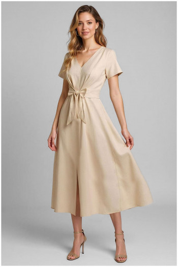Elegantna, usko krojena haljina u krem nijansi sa V-izrezom, odvojivim lepršavim rukavi...