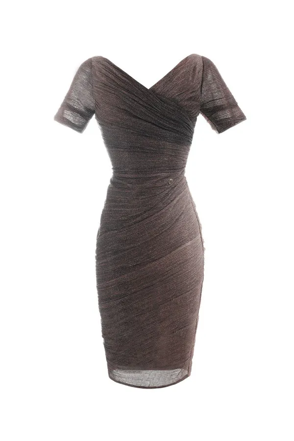 Elegantna, usko krojena haljina u crnoj nijansi sa V-izrezom, odvojivim lepršavim rukav...