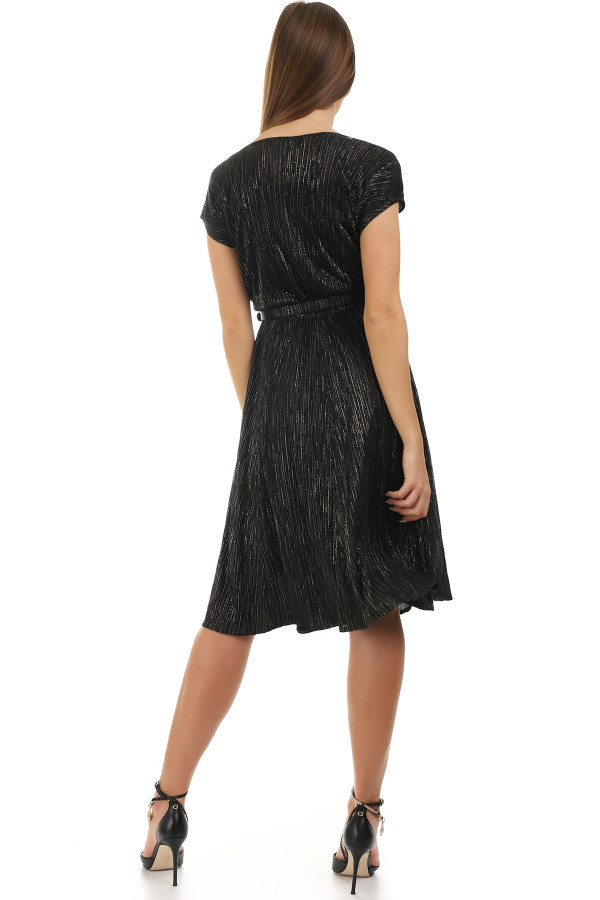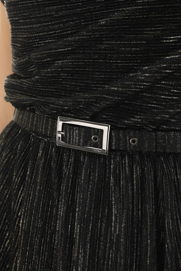 Svečana haljina crne boje, lepršavog kroja sa kaišićem. Kaišić doprinosi prefinjenom izgledu i naglašava struk, a po potrebi ga možete skinuti. “A kroj” će učiniti da svaka figura u ovom modelu izgleda perfektno. Zonu dekoltea oplemenjuju nabori koji unose notu ženstvenosti u Vaš stajling. U zavisnosti od izbora aksesoara i obuće možete je nositi u različitim prilikama.