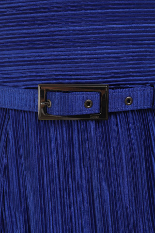 Svečana haljina plave boje i lepršavog kroja sa kaišićem. Kaišić doprinosi prefinjenom izgledu i naglašava struk, a po potrebi ga možete skinuti. “A kroj” će učiniti da svaka figura u ovom modelu izgleda perfektno. Zonu dekoltea oplemenjuju nabori koji unose notu ženstvenosti u Vaš stajling. U zavisnosti od izbora aksesoara i obuće možete je nositi u različitim prilikama.