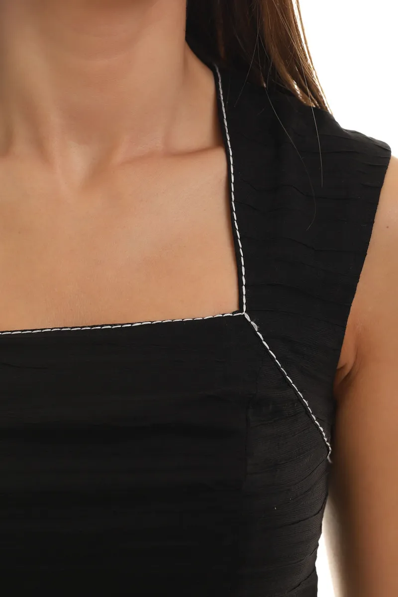 Elegantna crna haljina sa suptilnim sjajem i ženstvenom siluetom za svečane prilike.