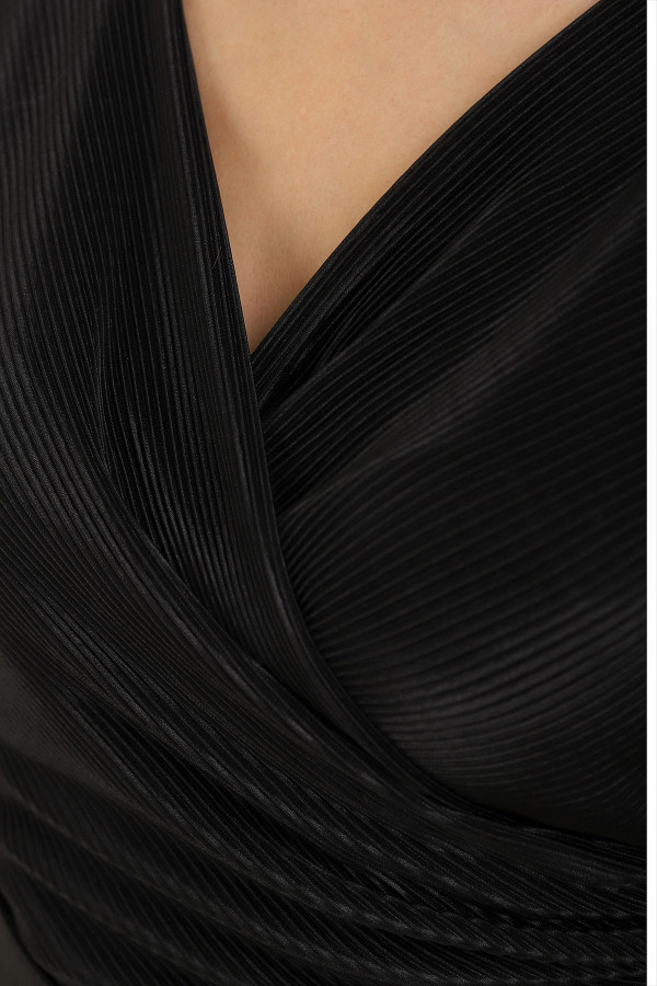 Elegantna crna haljina sa suptilnim sjajem i ženstvenom siluetom za svečane prilike.