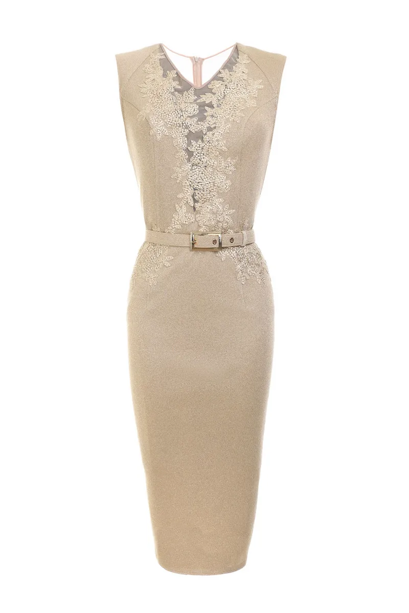 Elegantna, usko krojena haljina u krem nijansi sa V-izrezom, odvojivim lepršavim rukavi...