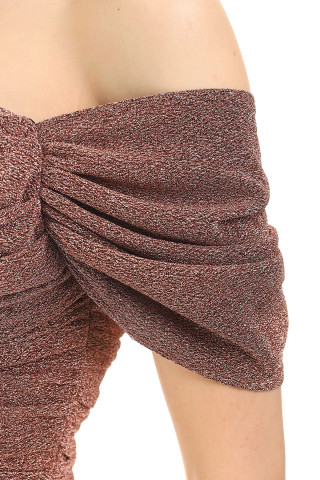 Glamurozna duga haljina koja ostavlja snažan utisak. Uzak kroj prati linije tela i savršeno ih naglašava. Nabori na predelu grudi i rukava dodaju notu ženstvenosti i prefinjenosti. Detalji koji ovu haljinu čine još atraktivnijom su šlic sa leve strane i metalizirana vlakna.