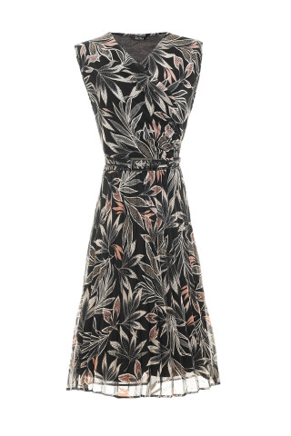 Široka haljina cvetnog dezena je odličan izbor za odlazak na kafu sa prijateljicama ali i kao deo modernog, poslovnog outfita. Kaiš dodatno naglašava struk a po potrebi ga možete skinuti. Uz dodatak Luna nakita, torbe i ešarpe Vaš look će biti savršeno stilizovan.