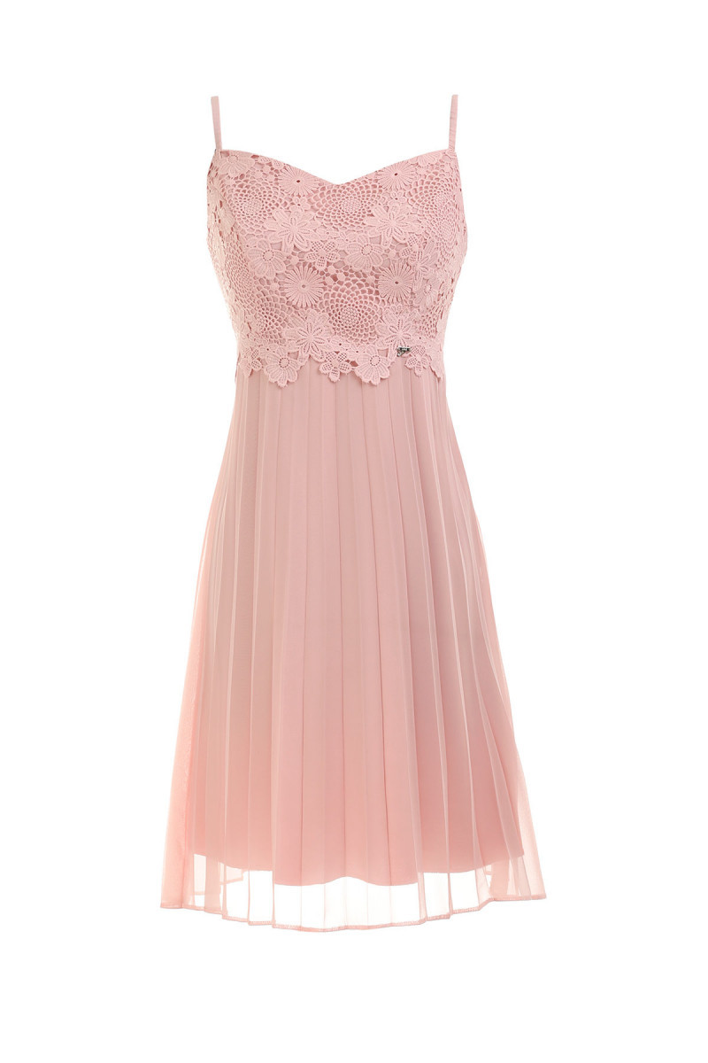 Plisirana kratka haljina. Gornji deo modela oplemenjen je čipkastim detaljima floralnog dezena koji unosi dozu ženstvenosti. Kako biste postigli savršeno stilizovan outfit, iskombinujte je sa Luna torbom i ešarpom.