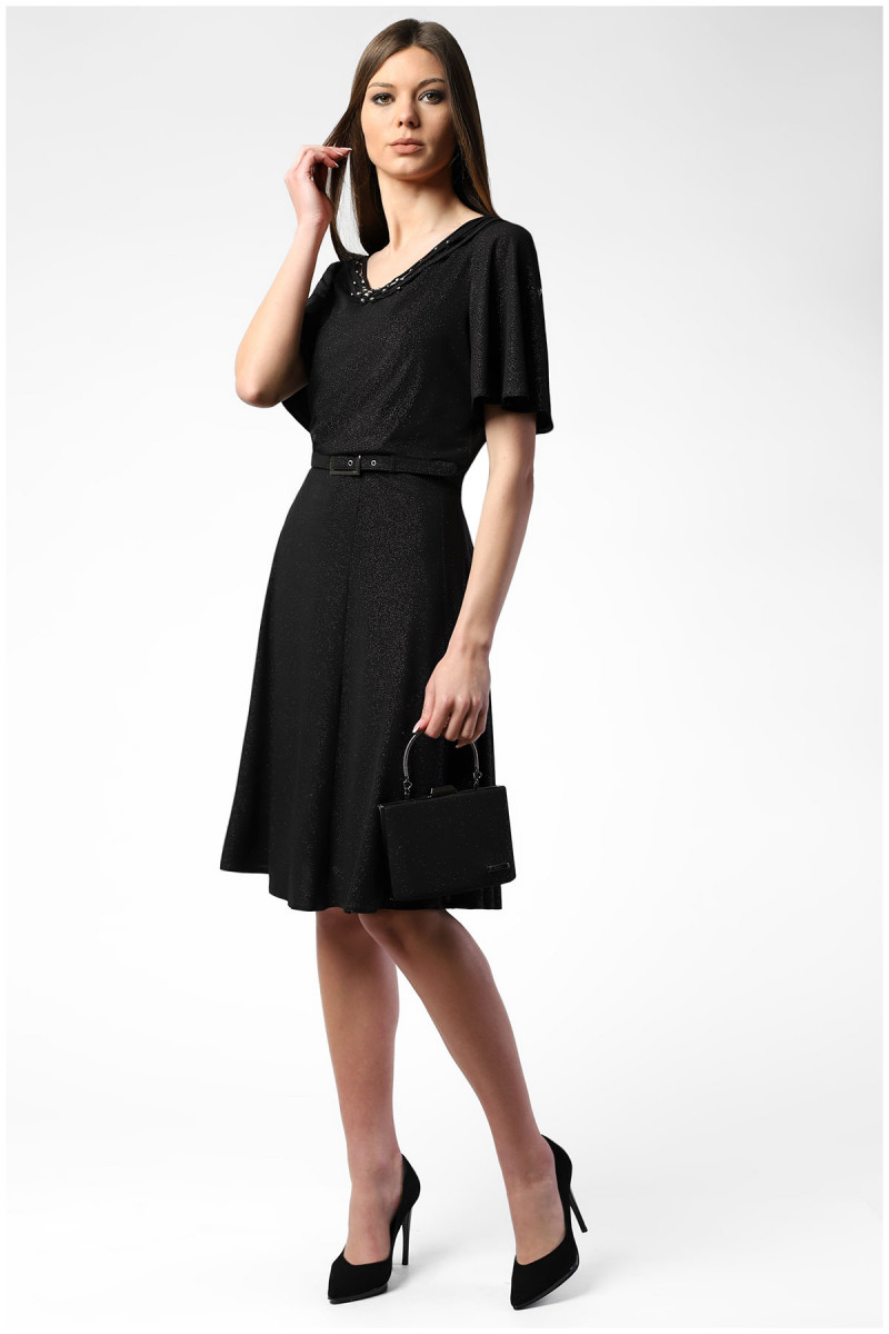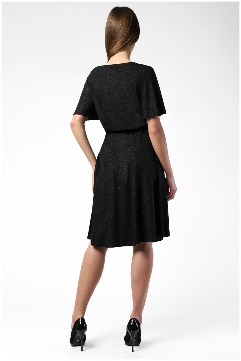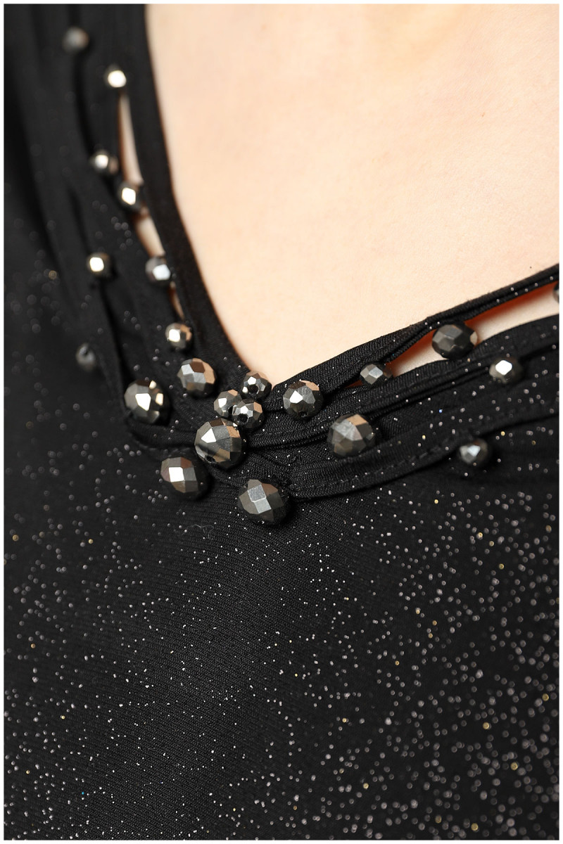 Crna uska haljina sa spuštenim ramenima, naborima i nežnim cirkonima u središtu dekolte...