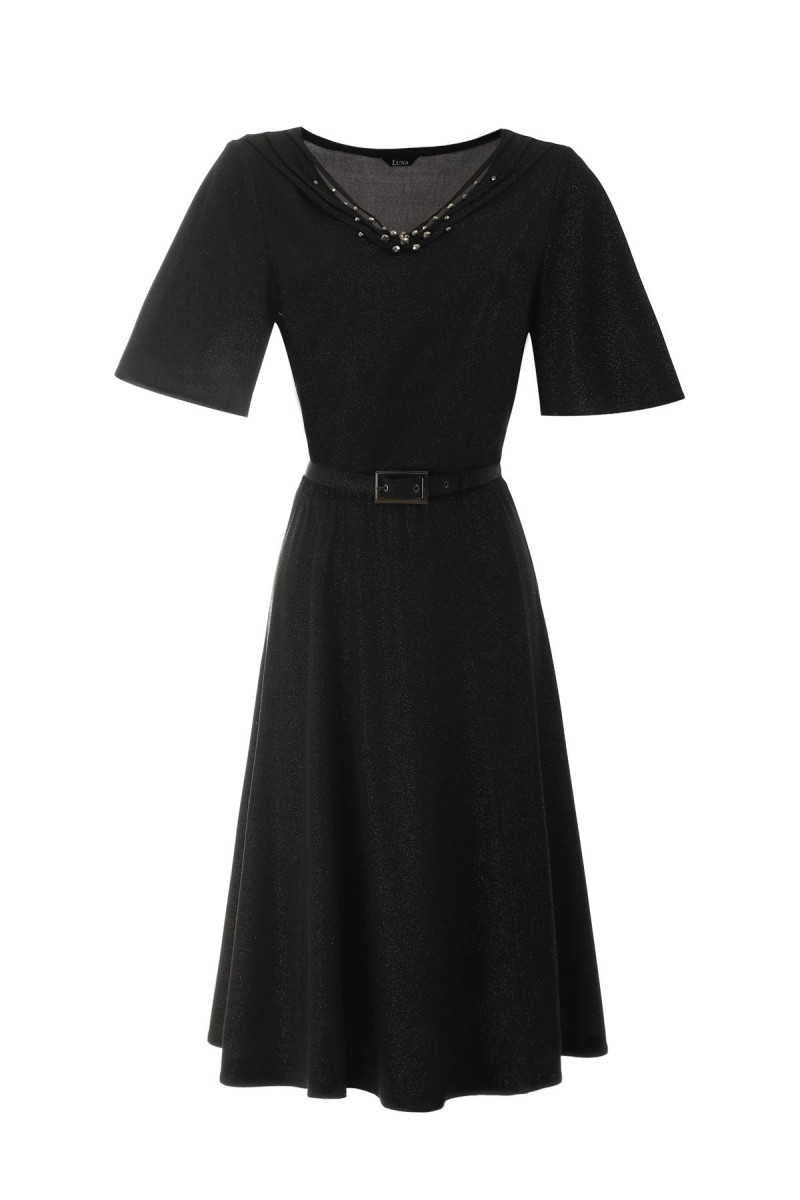 Bela haljina sa kaišem. Širi kroj čini je pogodnom za sve tipove građe. Linija dekoltea oivičena je ukrasnim detaljima, a celom dužinom haljine prostire se srebrni gliter. Viskozna postava čini je komfornom za nošenje. Uz Luna torbu i ešarpu Vaš outfit će biti savršeno uklopljen.