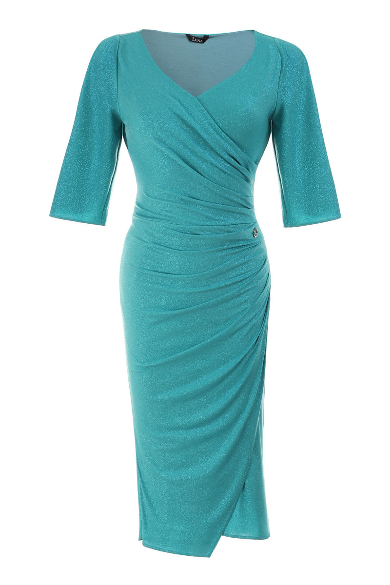 Uska tirkizna haljina na preklop. 3/4 lepršavi rukavi sa šlicem doprinose udobnosti ovog modela, a viskozna postava je čini vrlo prijatnom za nošenje. Uzak kroj obogaćen naborima ističe Vašu figuru i naglašava struk. Dodajte torbu iz iste linije, odaberite udobne cipele i Vaš outfit će biti besprekoran.
