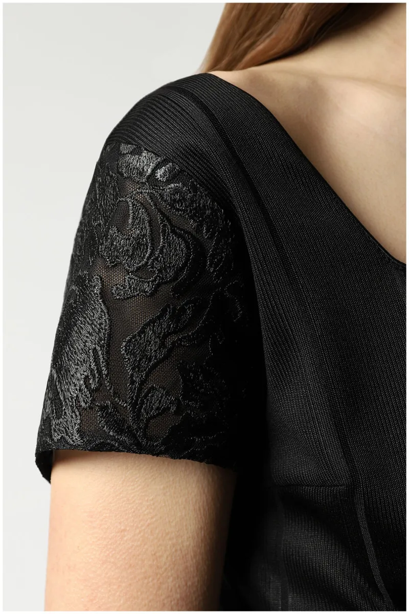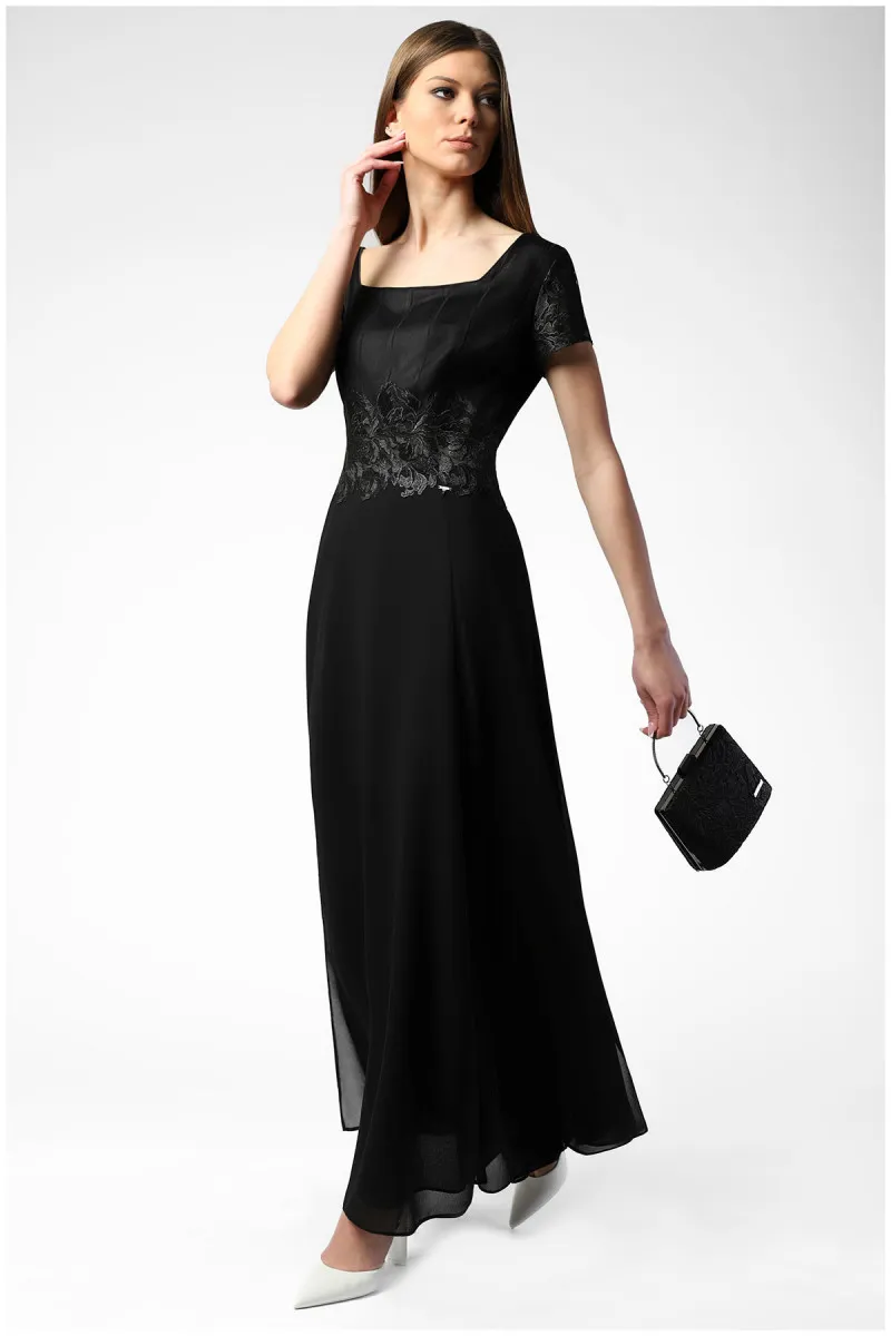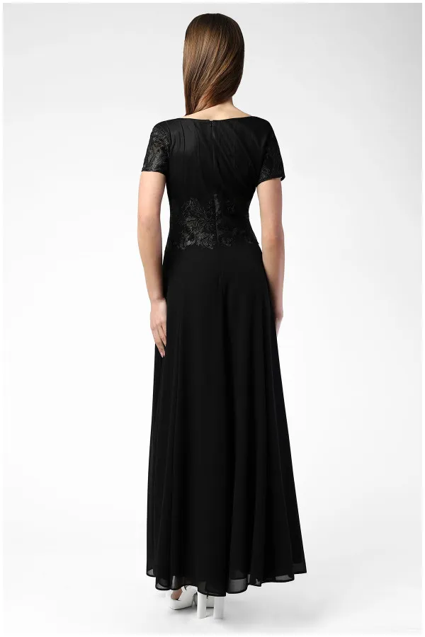 Duga crna haljina sa kratkim rukavima od čipke. Linija struka ukrašena je jedinstvenim radom koji dodaje notu sofisticiranosti. Dodajte ešarpu i dobićete elegantnu kombinaciju u kojoj ćete ostaviti snažan utisak na svakom svečanom događaju.
