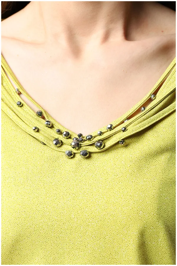 Bela haljina sa kaišem. Širi kroj čini je pogodnom za sve tipove građe. Linija dekoltea oivičena je ukrasnim detaljima, a celom dužinom haljine prostire se srebrni gliter. Viskozna postava čini je komfornom za nošenje. Uz Luna torbu i ešarpu Vaš outfit će biti savršeno uklopljen.
