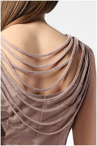 Kratka lepršava haljina u neutralnoj puder nijasni. Detalji koji doprinose autentičnosti ovog modela su transparentne trake, kao i resice na leđima. Kada se pripremate za svečane prilike, iskombinujte je sa ešarpom i torbom iz iste linije.