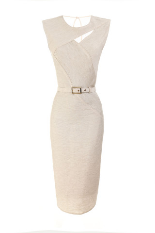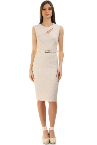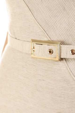 Bež svečana midi haljina sa V-izrezom, funkcionalnim dugmadima, odvojivim kaišem i lepr...