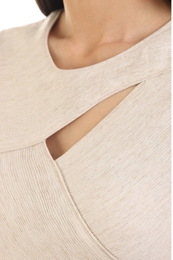 Ženstvena uska haljina od viskoze i lana. Kombinacija prirodnih materijala čini je vrlo komfornom. Transparentan zadnji deo i asimetričan izrez u predelu dekoltea dodaju autentičnost. Kaiš je detalj koji ističe Vaš struk i možete ga skinuti kada god poželite. Odaberite adekvatne cipele i torbu i stilizujte svoj outfit.