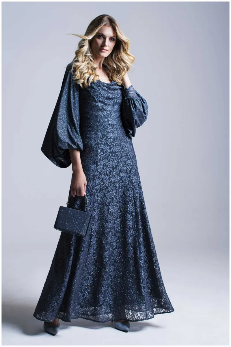 Raskošna duga haljina u plavoj boji. Viskozna postava čini je komfornom. Model je ukrašen prefinjenom čipkom koja je prekrivena svetlucavim premazom. Dodajte Luna ešarpu i nakit kako biste upotpunili odevnu kombinaciju za svečane prilike.
