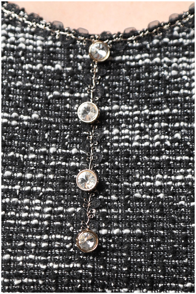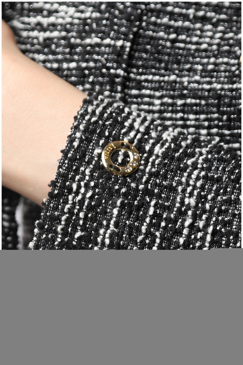 Crno-bela uska haljina protkana lameom odličan je izbor za svakodnevne outfite. Paspul je protkan zlatnim tilom koji u kombinaciji sa ukrasnim dugmadima dodaje notu sofisticiranosti. Iskombinujte je sa mantilom iz iste kolkekcije kako biste kreirali odlično stilizovan outfit.