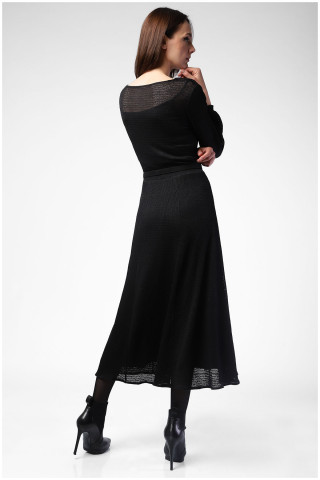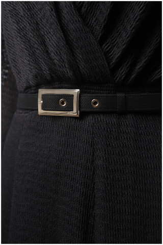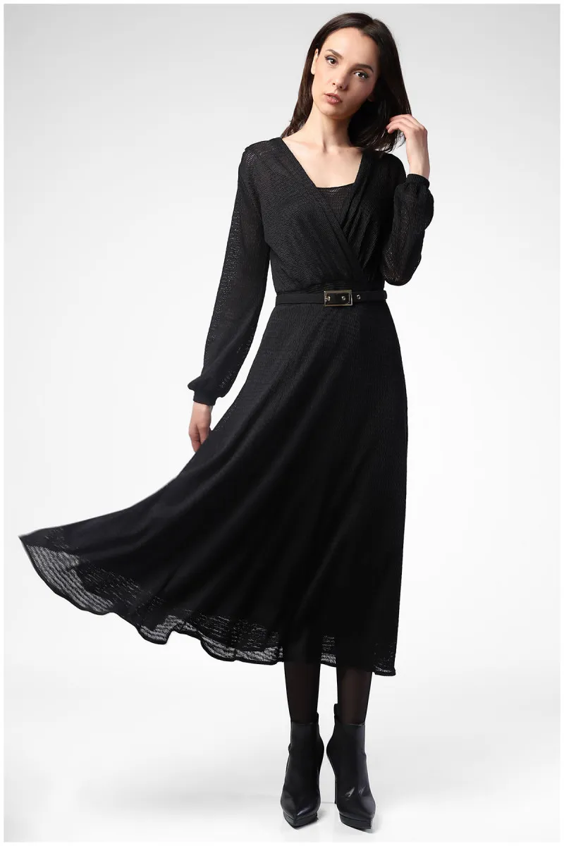 Duga haljina od mrežaste tkanine u crnoj boji savršeno pristaje svim tipovima građe. Notu ženstvenosti dodaje elegantni dekolte na preklop.