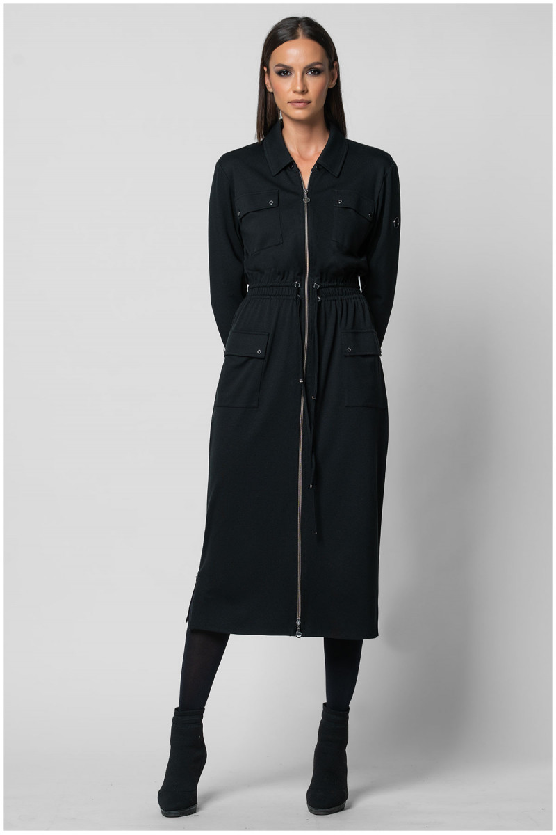 Crna haljina dugih rukava sa elastičnim pojasom koja se savršeno prilagođava Vašoj figuri. Dvopotezni rajsferšlus po sredini, kao i rajsferšlusi na bočnim stranama, omogućavaju podešavanje šliceva na ovom modelu.