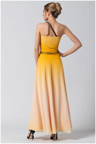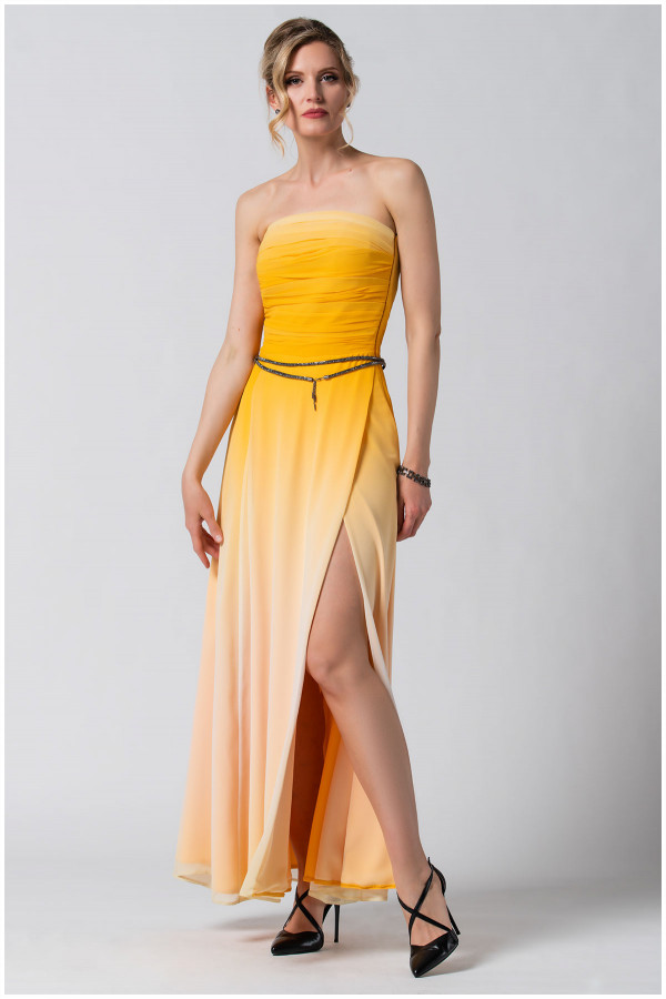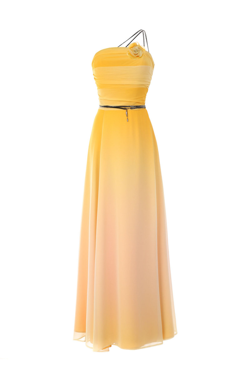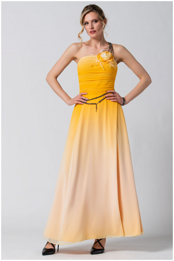 Duga haljina u ombre žutoj boji. Oplemenjena je naborima u predelu biste u formi korseta. Rajsferšlus koji se nalazi sa bočne strane olakšava oblačenje. Ukoliko želite da postignete svedeniji look, kaiš u vidu nakita, bretele kao i broš u vidu cveta možete skinuti.