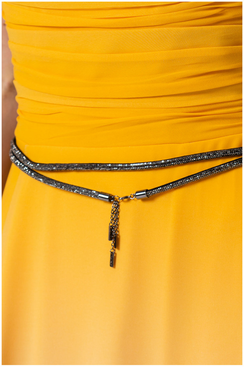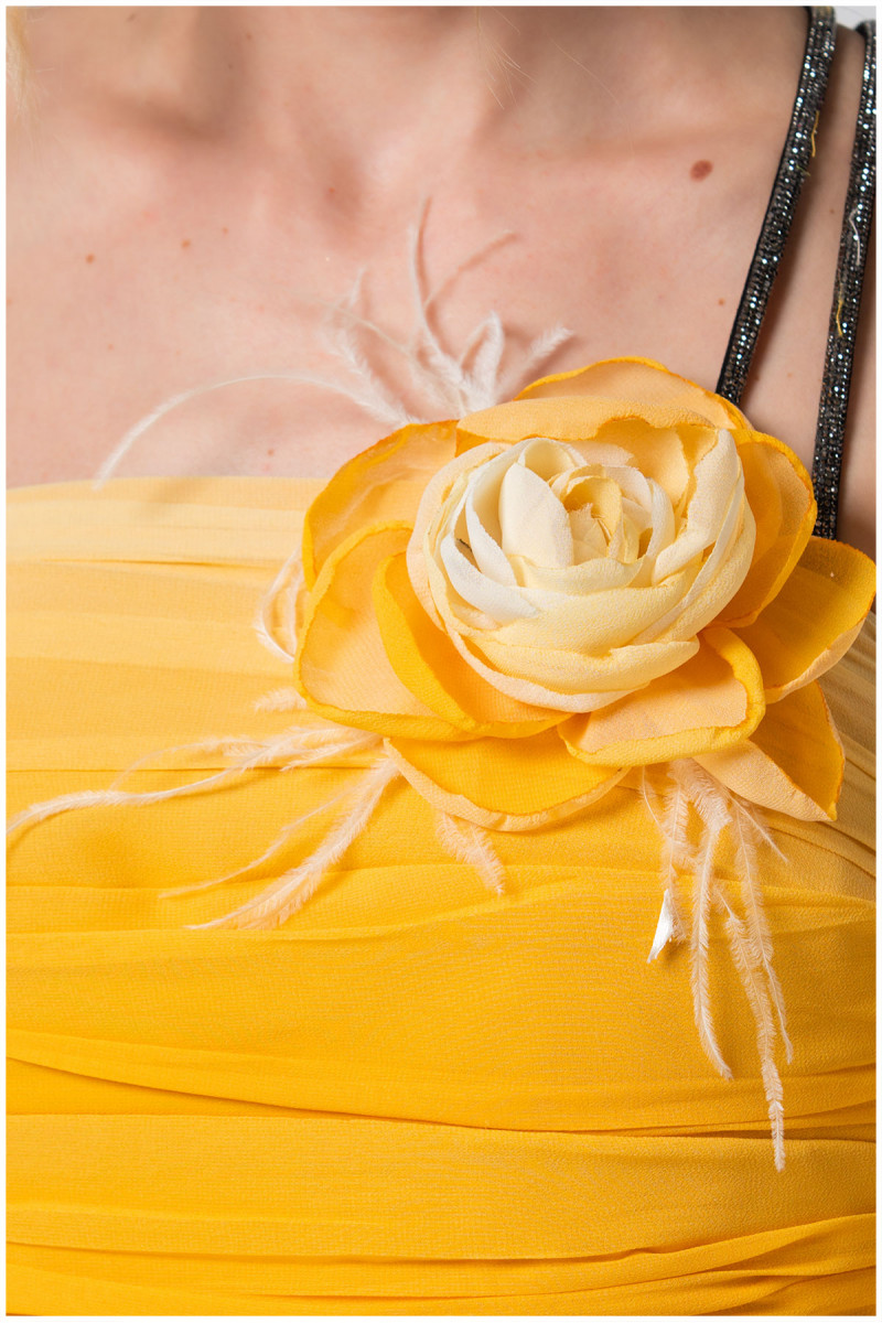 Duga haljina u ombre žutoj boji, oplemenjena je naborima u predelu biste. Ukoliko želite da postignete svedeniji look, kaiš u vidu nakita, bretele i cvet u formi broša na magnet možete skinuti.