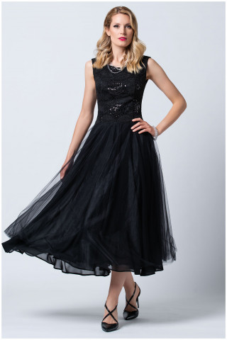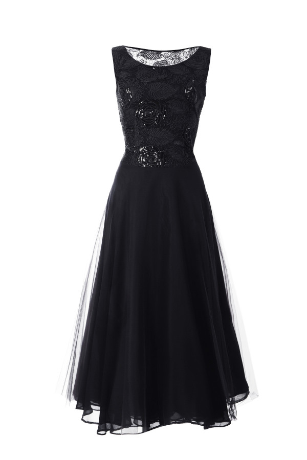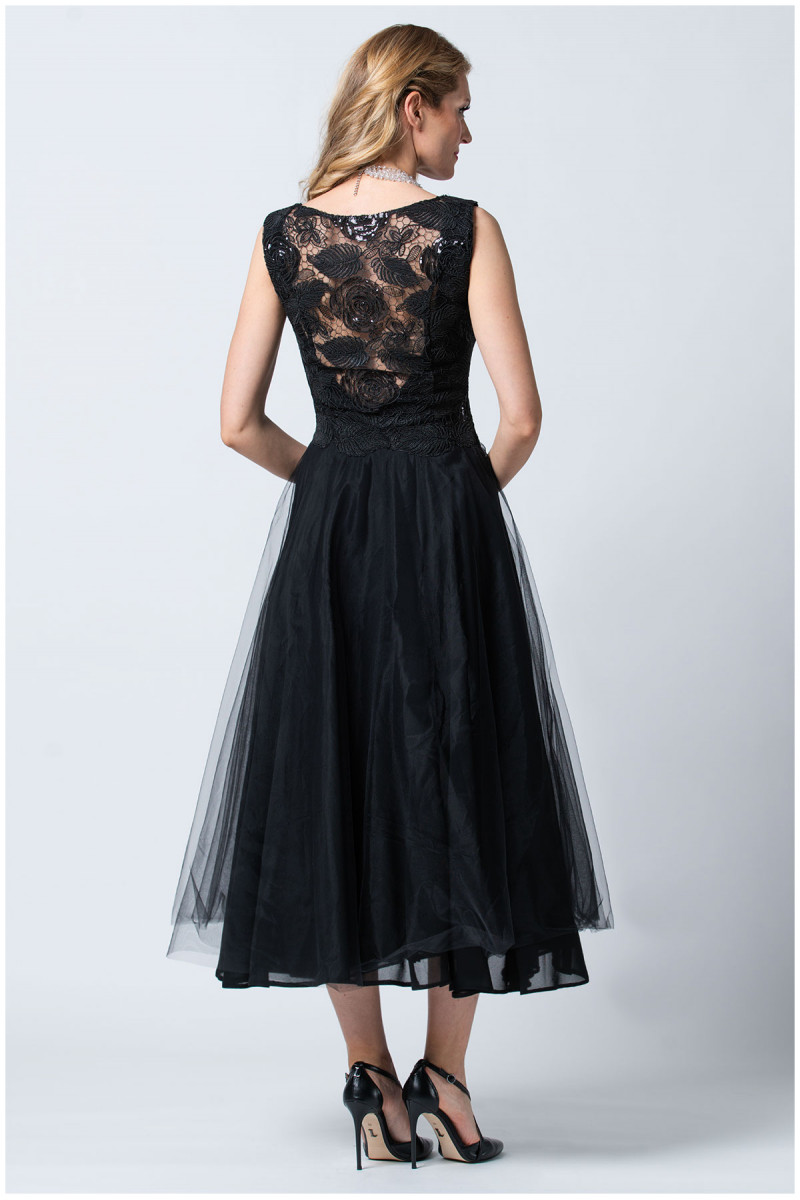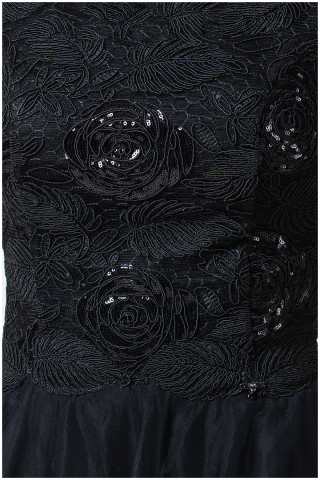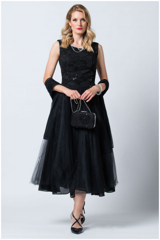 Svečana haljina crne boje lepršavog kroja, idealna je za svečane prilike. Gornji deo modela oplemenjen je autentičnim detaljima floralnog dezena koji unosi dozu ženstvenosti. U kombinaciji sa ešarpom i torbicom iz iste kolekcije postići ćete savršeno stilizovan look.