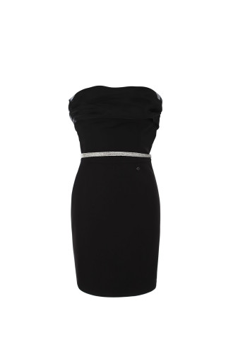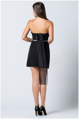 Efektna mini korset haljina koja prati liniju tela. Oplemenjena je crnim tilom i ukrasnim kaišem koji po želji možete skinuti i tako dobiti malu crnu haljinu. Savršeno se stilizuje sa Luna cvetnim brošem na magnet.