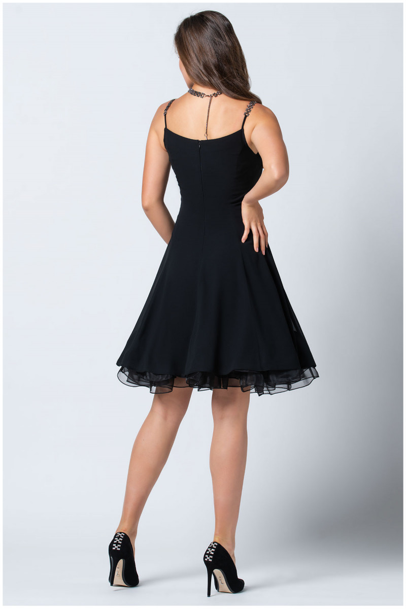 Elegantna lepršava kratka haljina. Efektni detalji oplemenjuju bretele čineći model posebnim i jedinstvenim. Savršeno se stilizuje sa Luna cvetnim brošem, torbicom i cipelama.
