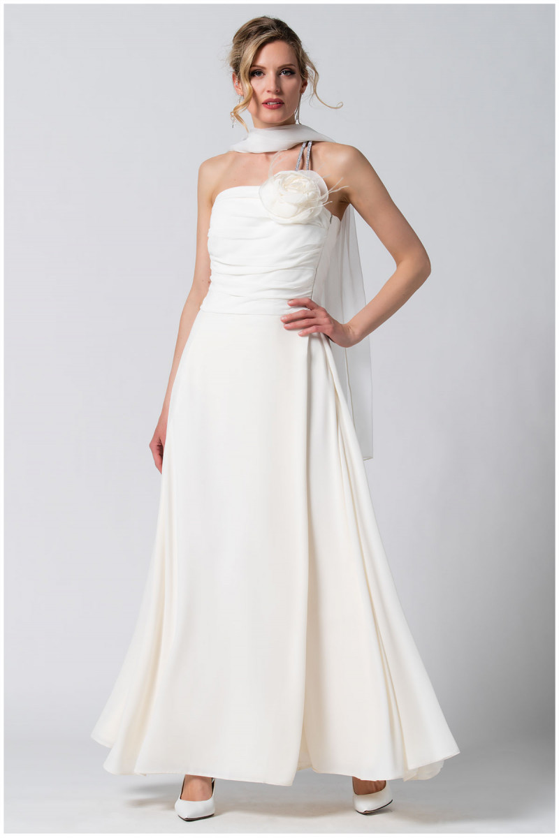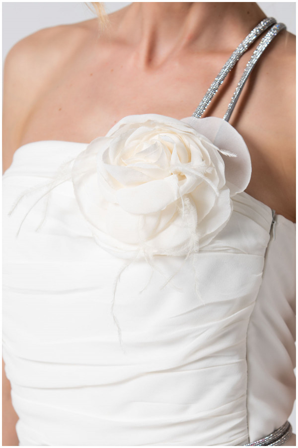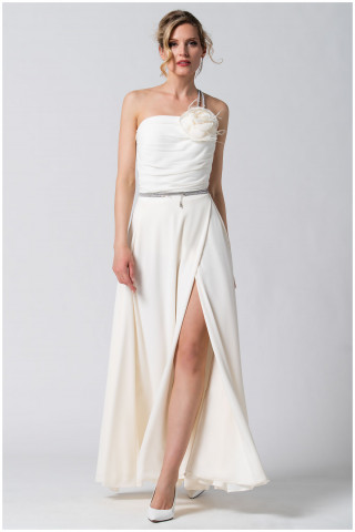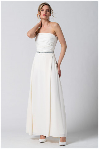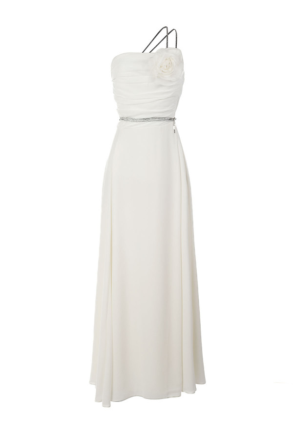 Duga haljina u beloj boji. Oplemenjena je naborima u predelu biste u formi korseta. Rajsferšlus koji se nalazi sa bočne strane olakšava oblačenje. Ukoliko želite da postignete svedeniji look, kaiš u vidu nakita, bretele i cvet u formi broša na magnet možete skinuti.