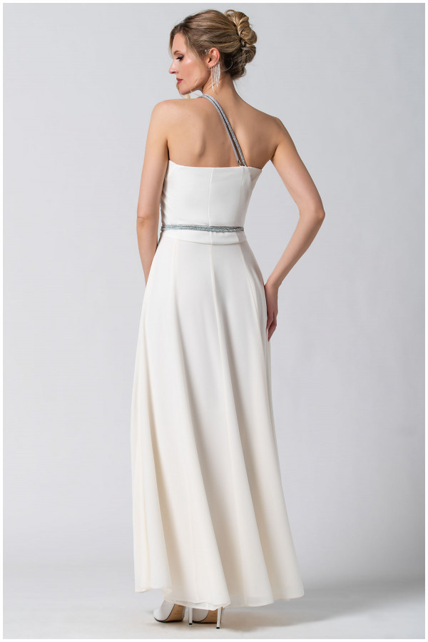Duga haljina u ombre beloj boji, oplemenjena je naborima u predelu biste. Ukoliko želite da postignete svedeniji look, kaiš u vidu nakita, bretele i cvet u formi broša na magnet možete skinuti.