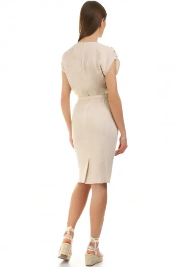 Bež haljina na preklop koja prati liniju tela. Dugmad i ukrasna šnala na kaišu ovom modelu dodaju notu sofisticiranosti. Ovaj model je skrojen tako da odgovara i savršeno pristaje svim tipovima građe.
