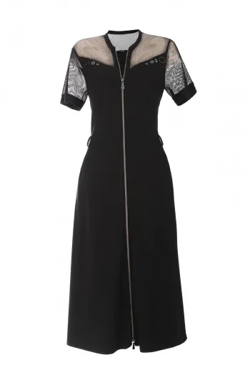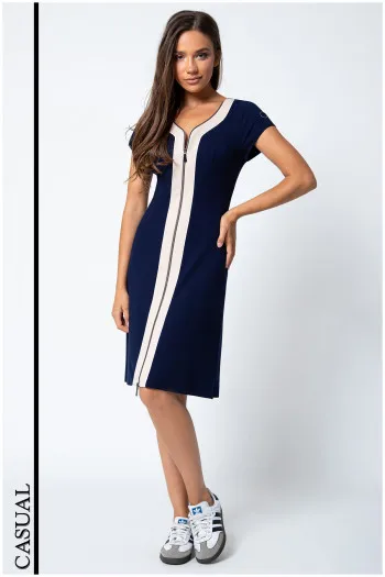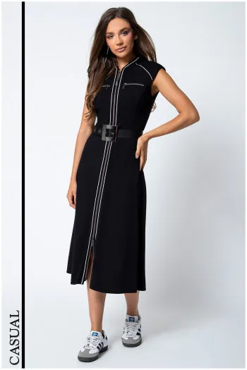 Praktična duga haljina modernog kroja sa kontrasnim detaljima sa prednje strane.
