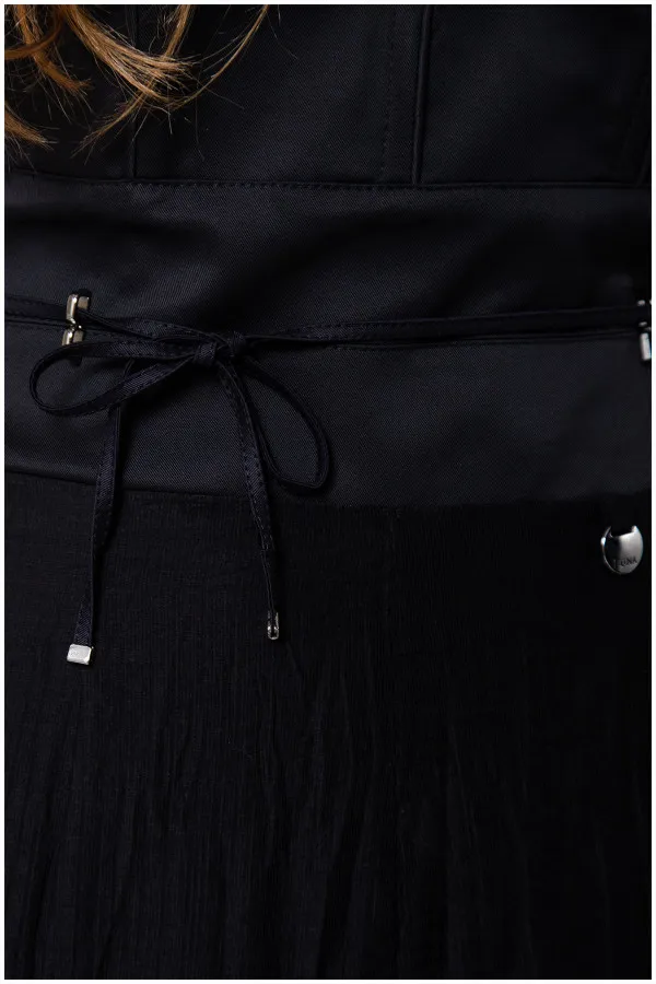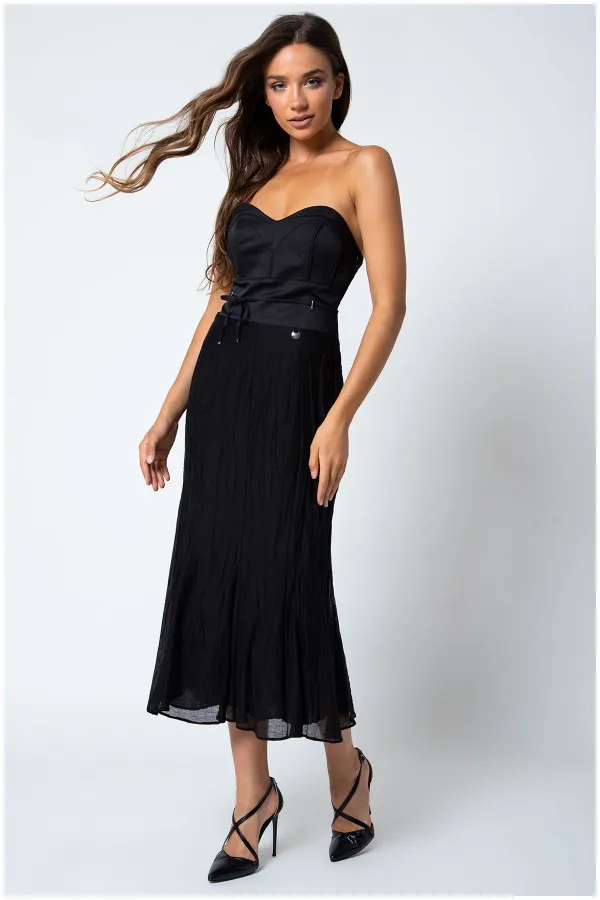 Midi haljina u crnoj boji koju možete nositi sa i bez bretela. Gornji deo haljine je u vidu korseta koji se podešava zatezanjem satenske trake na ledjima. Njena klasična forma i dužina ističe Vašu figuru dok izazovni srcoliki dekolte pružiće dodatnu dozu šarma Vašem izgledu.