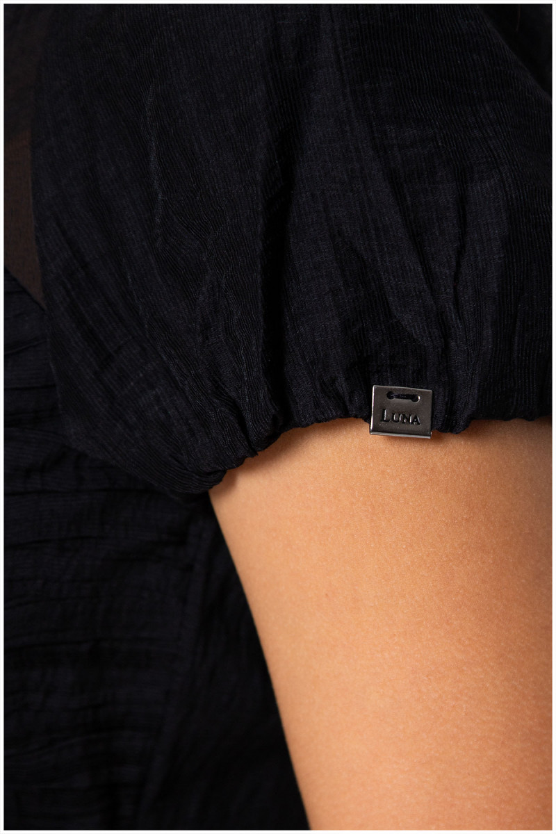 Haljina širokog kroja i kratkih rukava u crnoj boji. Moderan kroj i materijal učiniće da se u njoj osećate veoma komforno. Iskombinujte je sa LUNA cipelama i nakitom kako bi ste postigli savršeno stilizovani izgled.