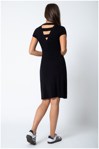 Praktična kratka haljina modernog kroja sa atraktivnim detaljem u vidu traka na leđima.