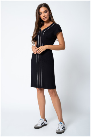 Praktična kratka haljina modernog kroja sa atraktivnim detaljem u vidu traka na leđima. Model poseduje dvopotezni rajsferšlus pomoću kojeg možete podesiti dubinu šlica.