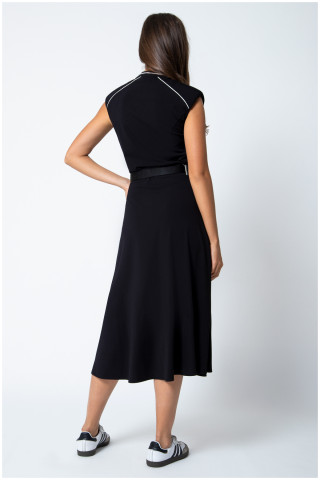 Praktična duga haljina modernog kroja sa kontrasnim detaljima sa prednje strane.