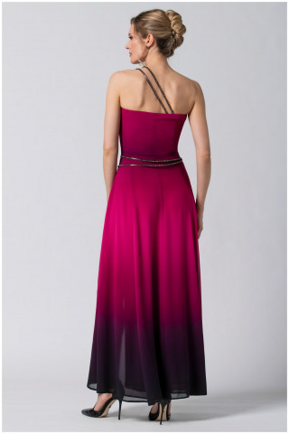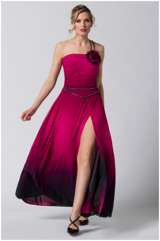 Duga haljina u ombre ciklama boji, oplemenjena je naborima u predelu biste. Ukoliko želite da postignete svedeniji look, kaiš u vidu nakita, bretele i cvet u formi broša na magnet možete skinuti.