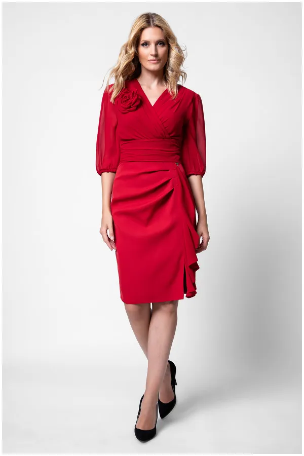 Elegantna haljina uskog kroja sa naborima u predelu biste i pojasa i prozirnim 3/4 rukavima.