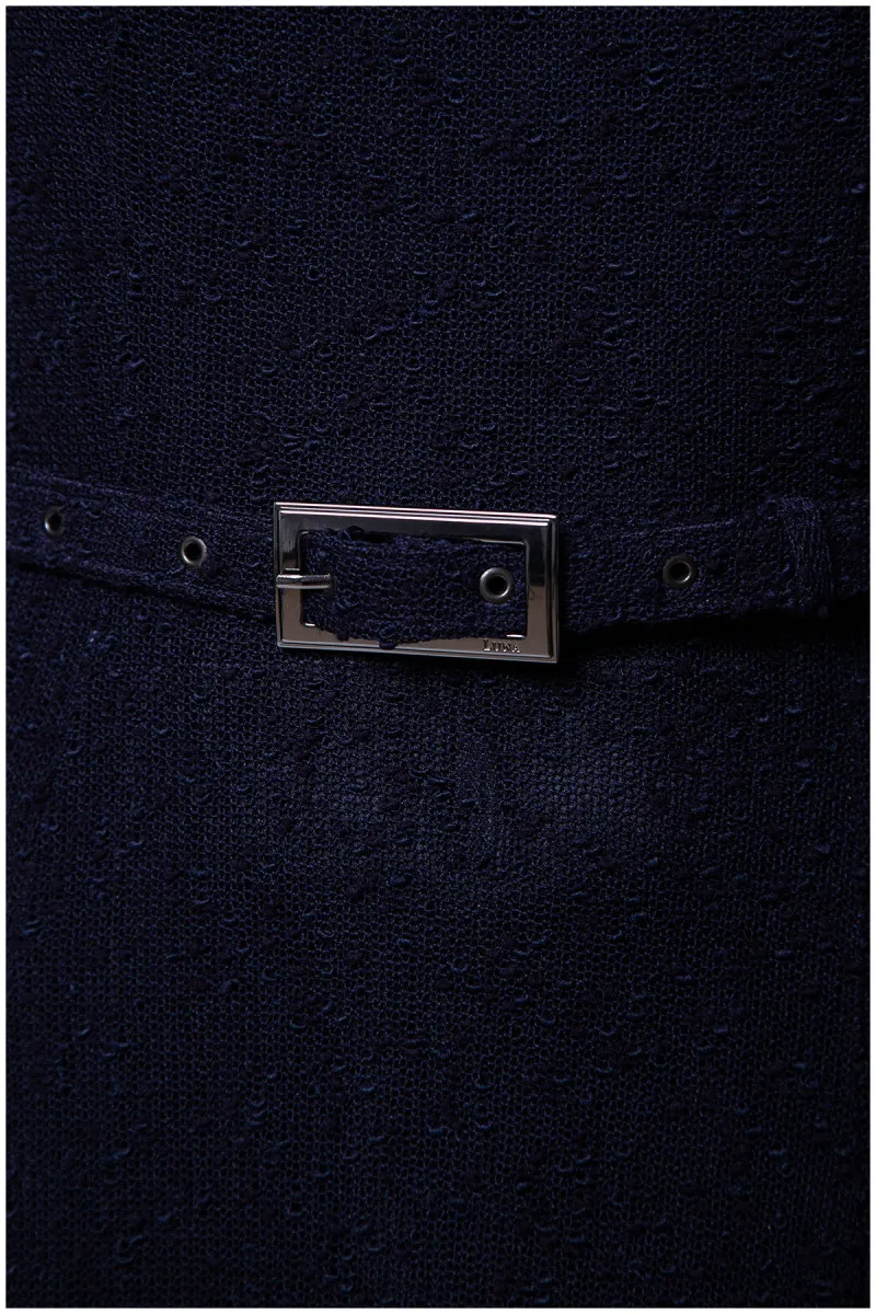 Midi haljina dugih rukava s manžetnama. Model poseduje kaiš istog dezena koji dodatno ističe struk. Visoki procenat elastina čini je veoma je udobnom za nošenje.