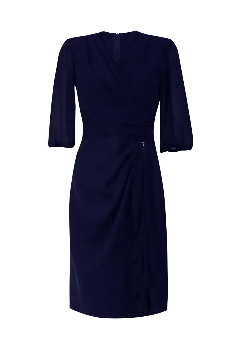 Elegantna haljina uskog kroja sa naborima u predelu biste i pojasa I prozirnim 3/4 rukavima.
