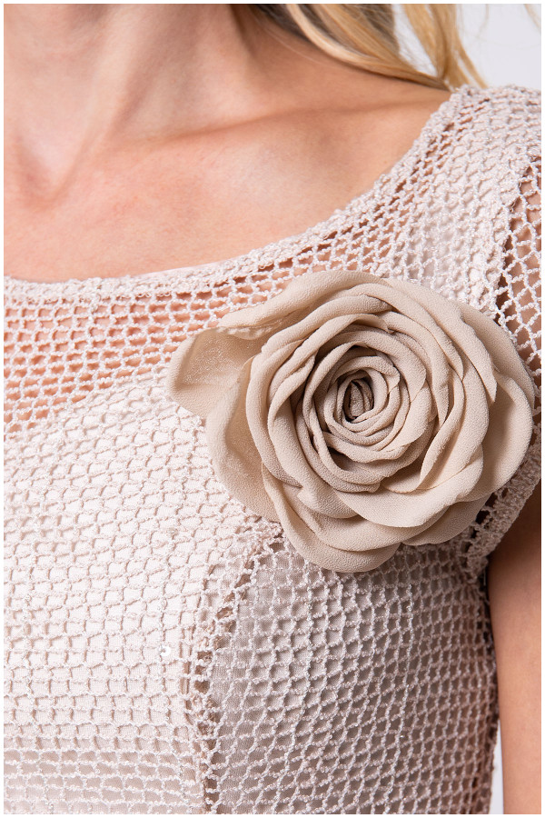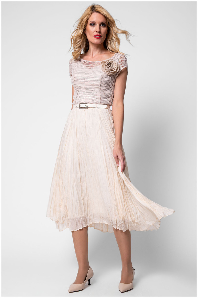 Lepršava midi haljina u bež boji, oplemenjena je čipkom u predelu biste.