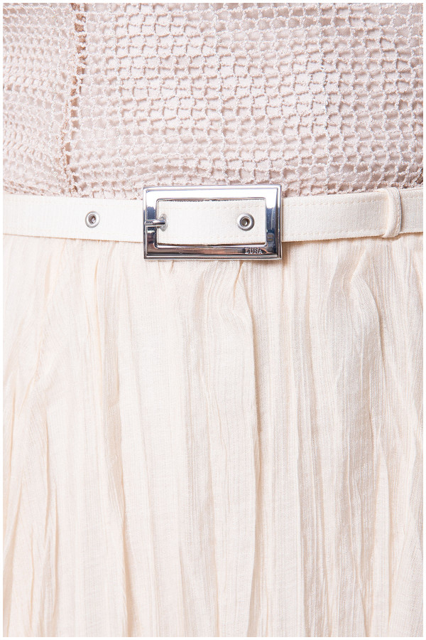 Lepršava midi haljina u bež boji. Oplemenjena je čipkom u predelu biste. Kaiš je detalj koji doprinosi raskošnom izgledu ovog modela i dodatno naglašava Vaš struk. Uz efektan nakit i Luna cipele dobićete savršen outfit za svaku priliku.