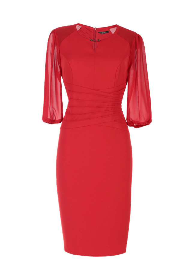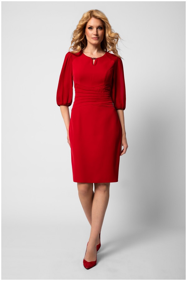 Elegantna crvena haljina 3/4 rukava čiji kroj prati liniju tela ističući Vašu ženstvenost. Oplemenjena je naborima u predelu struka koji dodatno naglašavaju struk. Dodajte Luna nakit i torbicu i spremni ste za važan događaj.
