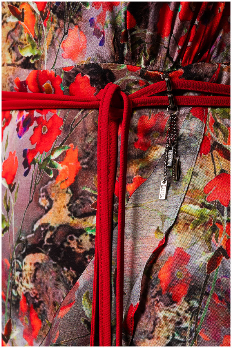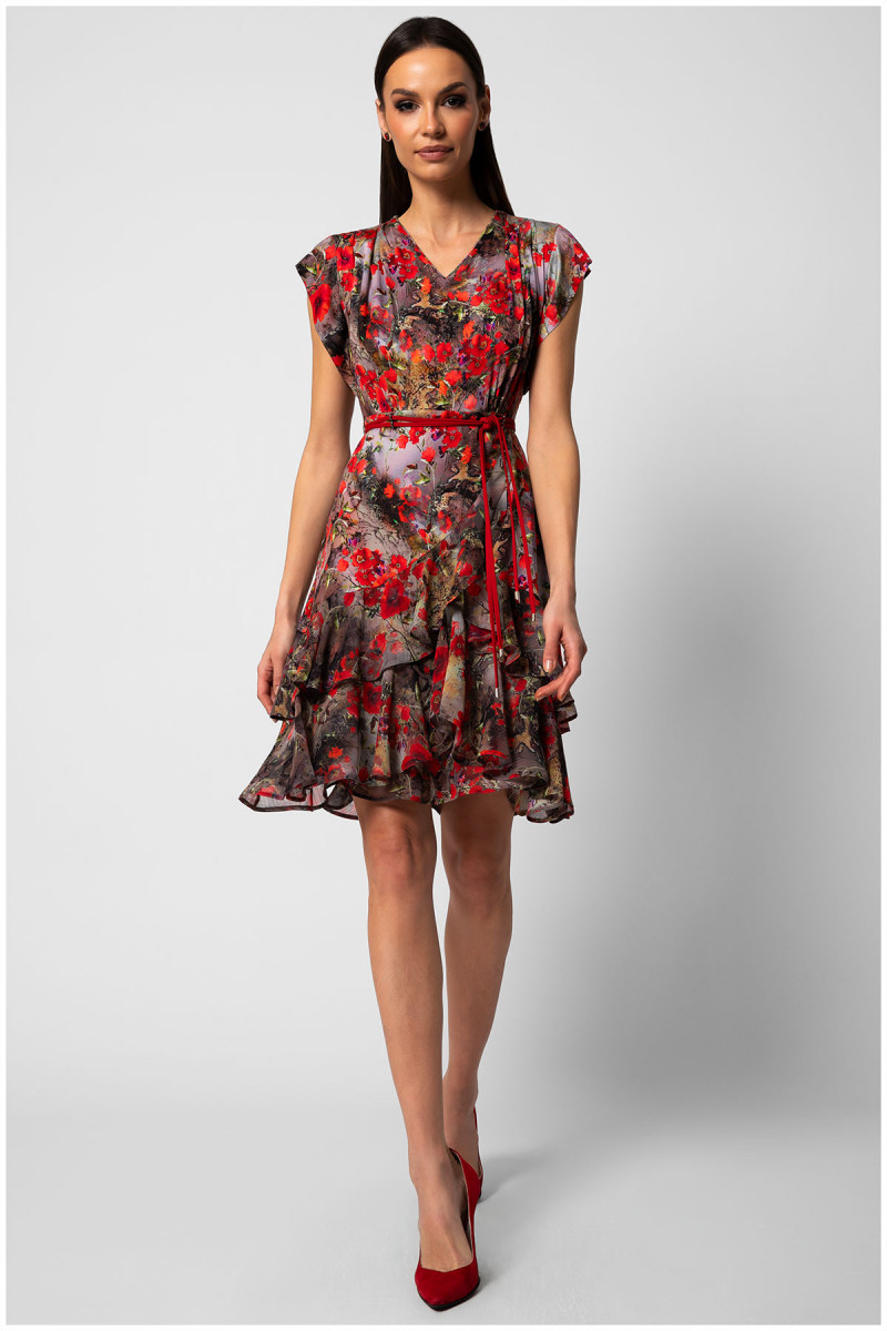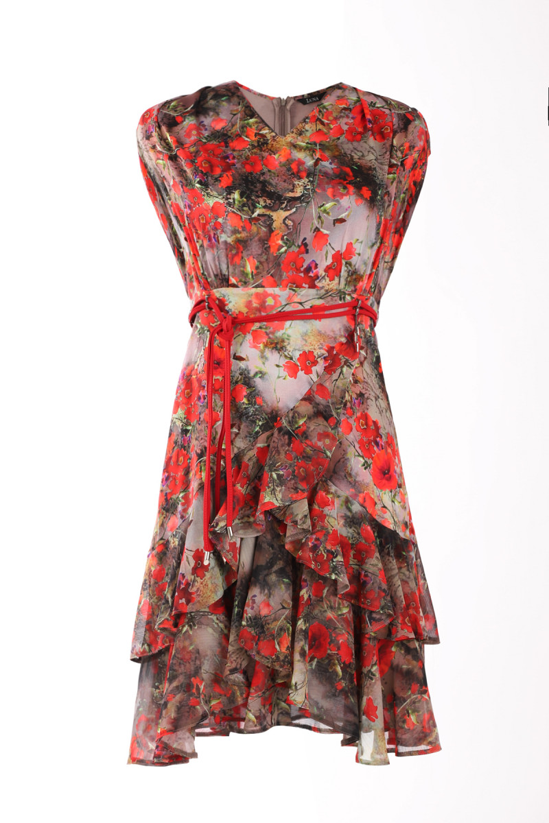 Ženstvena kratka haljina sa karnerima floralnog dezena. Kroj savršeno pristaje svim tipovima građe dok traka na vezivanje dodatno ističe struk i figuru. Uz efektan nakit i Luna cipele dobićete savršen outfit za svaku priliku.