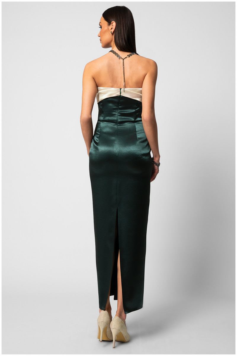 Elegantna duga haljina uskog kroja prati liniju tela i savršeno je naglašava. Poseban šarm ovoj haljini daju bretele koje se vezuju oko vrata. Detalj koji ovu haljinu čini još atraktivnijom je šlic sa leve strane.