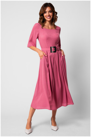 Midi haljina šireg kroja sa kratkim rukavima. Ukrasna šnala u formi kaiša dodatno naglašava struk a viskozni materijal čini je udobnom i prijatnom za nošenje. Savršeno se kombinuje sa cipelama i nakitom iz Luna asortimana.