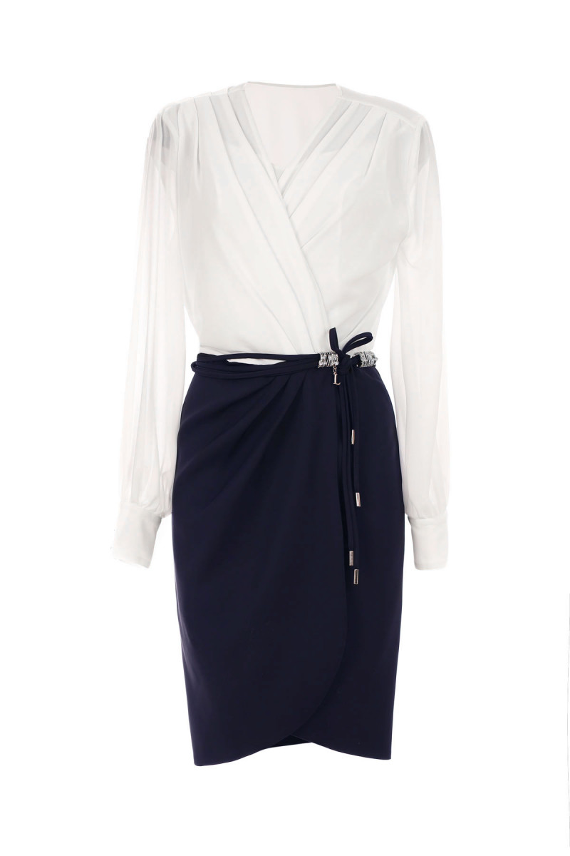 Elegantna kratka haljina na preklop odlična je za posebne trenutke. Oplemenja je paspulima u predelu dekoltea, dok kaiš dodatno naglašava struk. Viskozna postava čini je vrlo udobnom i prijatnom za nošenje.